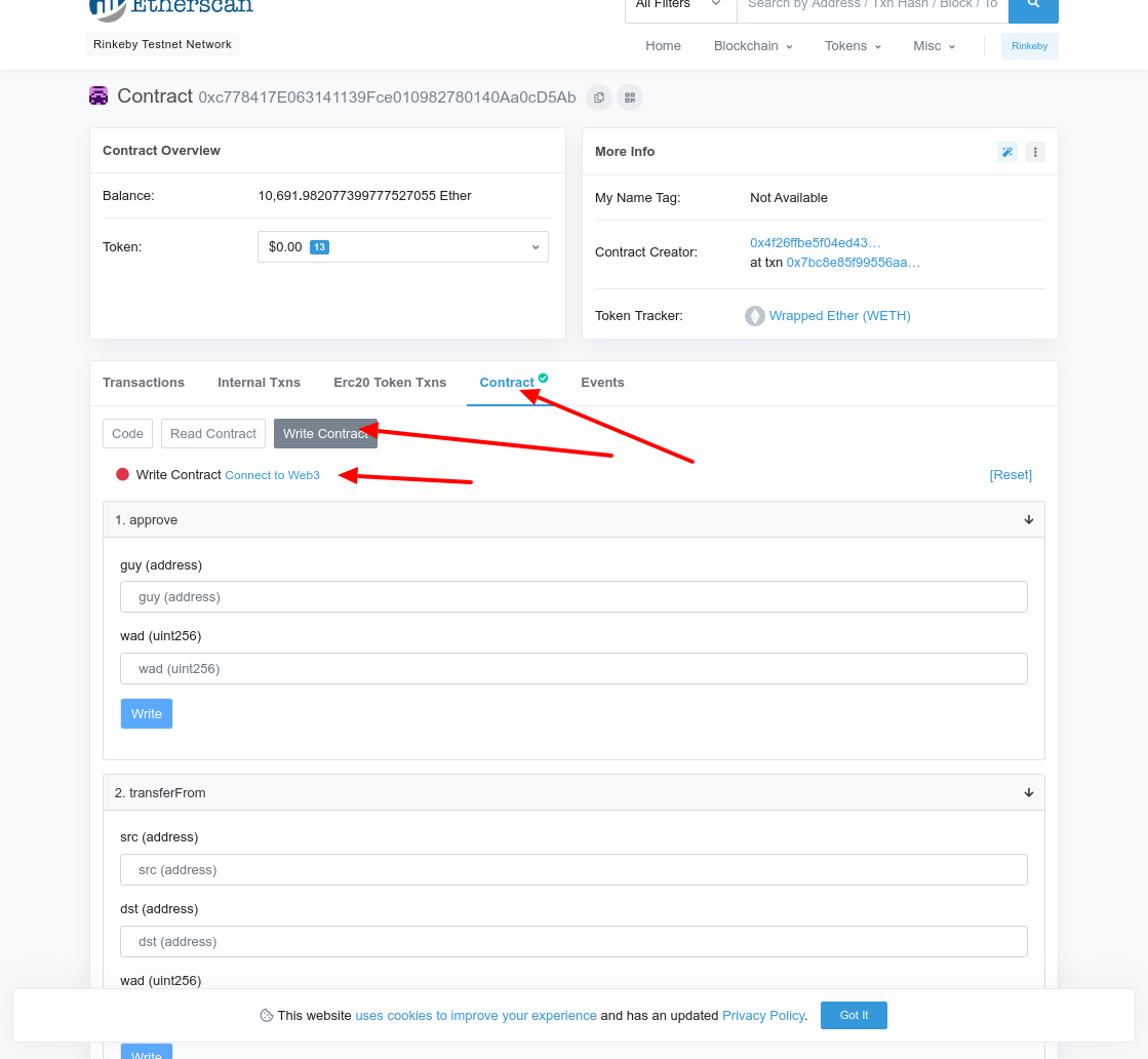 Go to the Contract > Write Contract and to connect your wallet, click on "Connect on Web3"