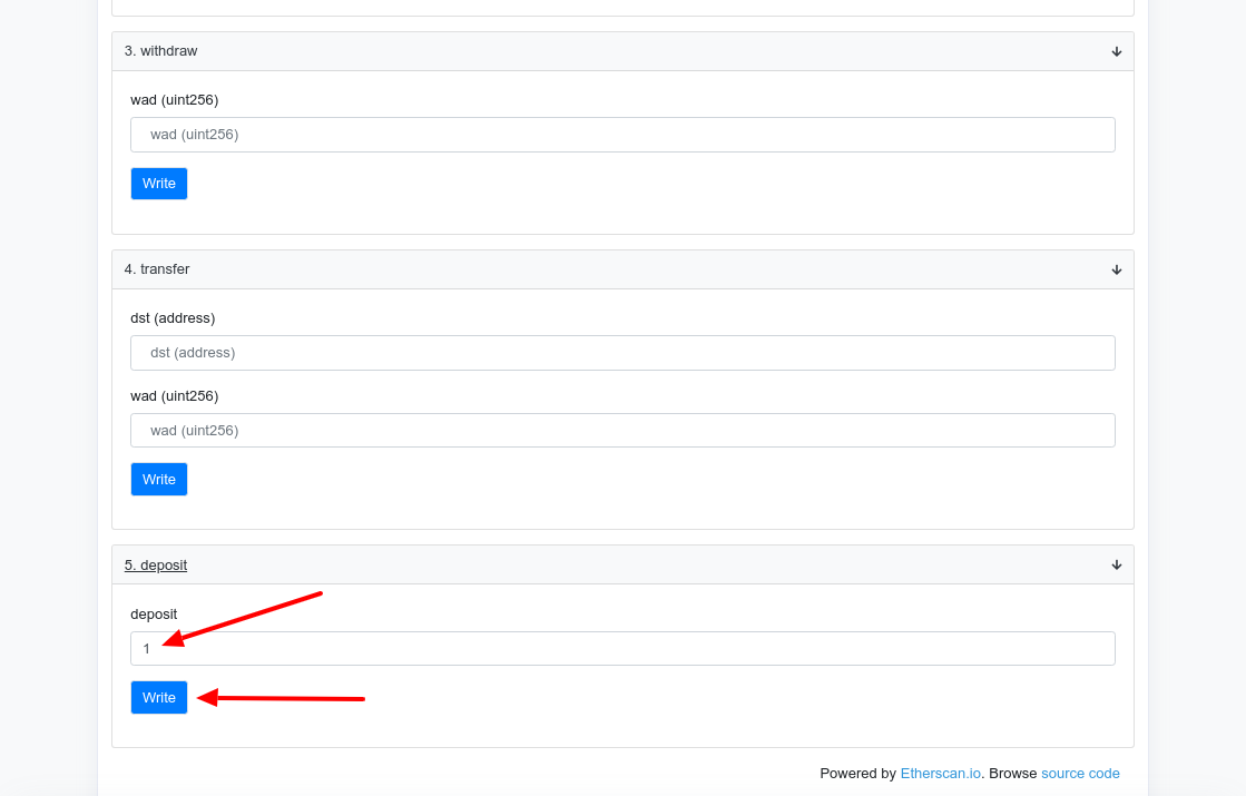 Go to function "5. deposit" and write the amount of ETH you would like to wrap to WETH, Click "Write" and wait until your tx is mined